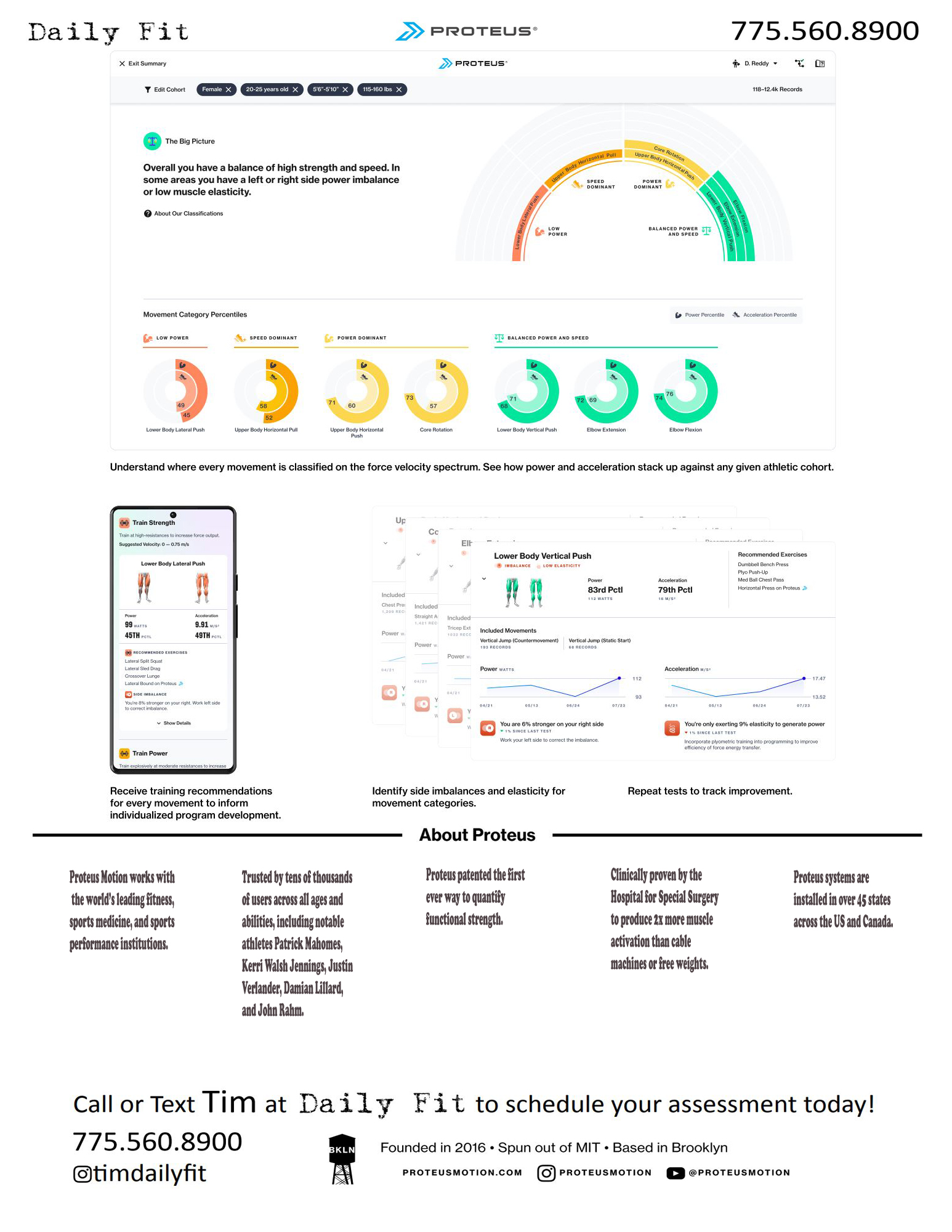 Discover precisely which body regions need to be stronger and faster. Test full body strength and speed in ~5 minutes. Track your improvement every time you test. Compare yourself to thousands of professional, college, and high school athletes. Get hyper-personalized training program recommendations.